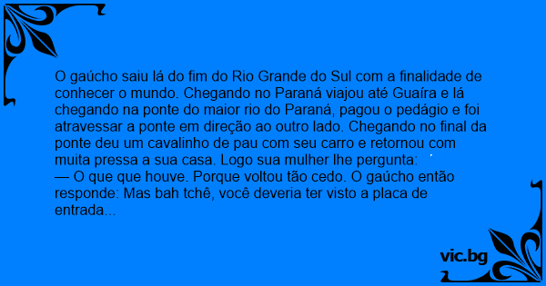 O gaúcho saiu lá do fim do Rio Grande do Sul com a finalidade de conhecer o mundo. Chegando no Paraná viajou até Guaíra e lá chegando na ponte do maior rio do Paraná, pagou o pedágio e foi atravessar a ponte em direção ao outro lado. Chegando no final da ponte deu um cavalinho de раu com seu carro e retornou com muita pressa a sua casa. Logo sua mulher lhe pergunta: