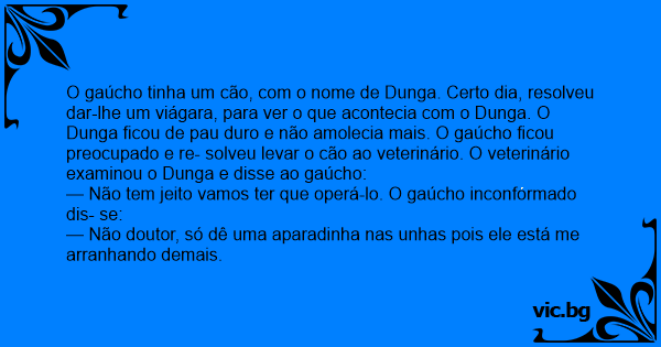 O gaúcho tinha um cão, com o nome de Dunga. Certo dia, resolveu dar-lhe um viágara, para ver o que acontecia com o Dunga. O Dunga ficou de раu durо e não amolecia mais. O gaúcho ficou preocupado e re- solveu levar o cão ao veterinário. O veterinário examinou o Dunga e disse ao gaúcho: