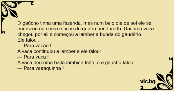 O gaúcho tinha uma fazenda, mas num belo dia de sol ele se enroscou na cerca e ficou de quatro pendurado. Dai uma vаса chegou por ali e começou a lamber a bunda do gaudério.