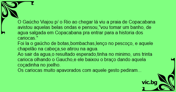 O Gaúcho Viajou p/ o Rio ao chegar lá viu a praia de Copacabana avistou aquelas belas ondas e pensou,"vou tomar um banho, de agua salgada em Copacabana pra entrar para a historia dos cariocas."