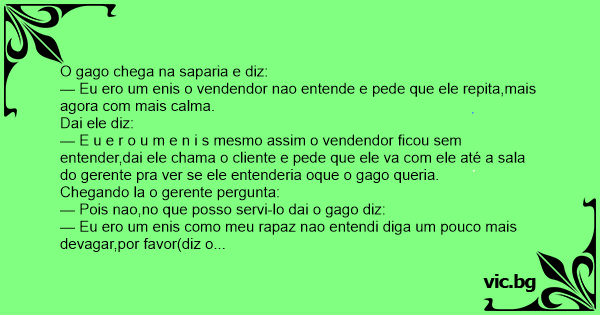 — E u e r o u m e n i s mesmo assim o vendendor ficou sem entender,dai ele chama o cliente e pede que ele va com ele até a sala do gerente pra ver se ele entenderia oque o gago queria.