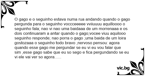O gago e o seguinho estava numa rua andando quando o gago pergunda para o seguinho voccceeeee vviiuuuu aquilloooo o seguinho fala; nao vi nao uma baidaaa de um morrenaaa e os dois continuaram a antar quando o gago;vocee viuu aquilooo seguinho responde; nao роrrа o gago ;uma baida de um loira gostozaaa o seguinho todo bravo ,nervoso pensou: agora quando esse gago me pergundar se eu vi eu vou falar que sim ,esse gago sabe que eu so sego e fiса pergundando se eu vi ele vai ver so agora... Passou um tempo e os dois antando e quando o gago fala voceee viuuuu issooo o seguinho; vi роrrа o gago fala , entao pporque pissouuuu.....