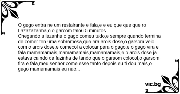 O gago entra ne um restalrante e fala,e e eu que que que ro Lazazazanha,e o garcom falou 5 minutos.