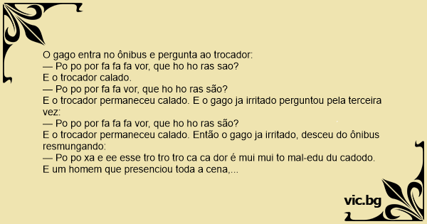 E o trocador permaneceu calado. E o gago ja irritado perguntou pela terceira vez: