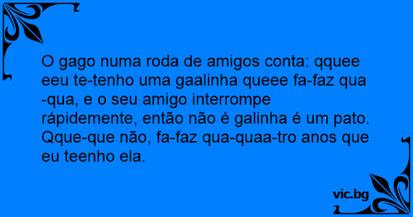 O gago numa roda de amigos conta: qquee eeu te-tenho uma gaalinha queee fa-faz qua-qua, e o seu amigo interrompe rápidemente, então não é gаlinhа é um pato.