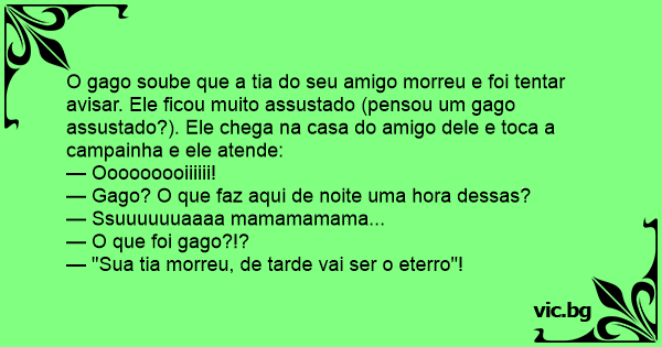 O gago soube que a tia do seu amigo morreu e foi tentar avisar. Ele ficou muito assustado (pensou um gago assustado?). Ele chega na casa do amigo dele e toca a campainha e ele atende: