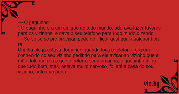Um dia ele já estava dormindo quando toca o telefone, era um conhecido do seu vizinho pedindo para ele avisar ao vizinho que a mãe dele morreu e que o enterro seria amanhã, o gaguinho falou que tudo bem, mas, estava muito nervoso, foi até a casa do seu vizinho, bateu na porta: