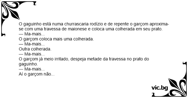 O gaguinho está numa churrascaria rodízio e de repente o garçom aproxima-se com uma travessa de maionese e coloca uma colherada em seu prato.