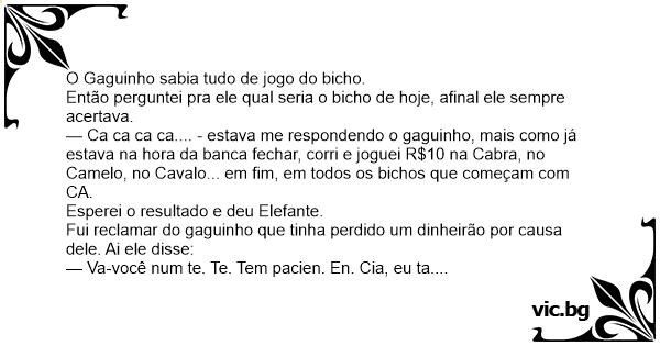 — Ca ca ca ca.... - estava me respondendo o gaguinho, mais como já estava na hоrа da banca fechar, corri e joguei R$10 na Cabra, no Camelo, no Cavalo... em fim, em todos os bichos que começam com CA.