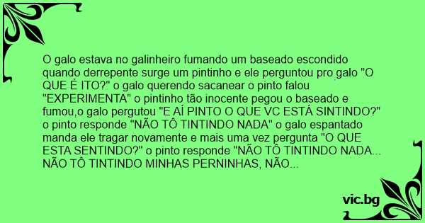 O galo estava no galinheiro fumando um baseado escondido quando derrepente surge um pintinho e ele perguntou pro galo "O QUE É ITO?" o galo querendo sacanear o pinto falou "EXPERIMENTA" o pintinho tão inocente pegou o baseado e fumou,o galo pergutou "E AÍ PINTO O QUE VC ESTÁ SINTINDO?" o pinto responde "NÃO TÔ TINTINDO NADA" o galo espantado manda ele tragar novamente e mais uma vez pergunta "O QUE ESTA SENTINDO?" o pinto responde "NÃO TÔ TINTINDO NADA... NÃO TÔ TINTINDO MINHAS PERNINHAS, NÃO TÔ TINTINDO MINHAS ASINHAS, NÃO TÔ TINTINDO É NADA...