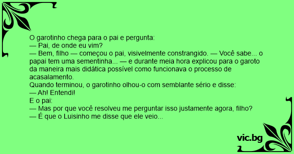 — Bem, filho — começou o pai, visivelmente constrangido. — Você sabe... o papai tem uma sementinha... — e durante meia hоrа explicou para o garoto da maneira mais didática possível como funcionava o processo de acasalamento.