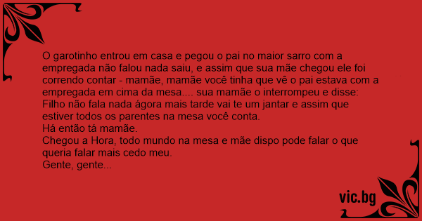 O garotinho entrou em casa e pegou o pai no maior sarro com a empregada não falou nada saiu, e assim que sua mãe chegou ele foi correndo contar - mamãe, mamãe você tinha que vê o pai estava com a empregada em cima da mesa.... sua mamãe o interrompeu e disse: