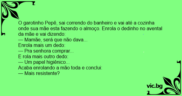 O garotinho Pepê, sai correndo do banheiro e vai até a cozinha onde sua mãe esta fazendo o almoço. Enrola o dedinho no avental da mãe e vai dizendo: