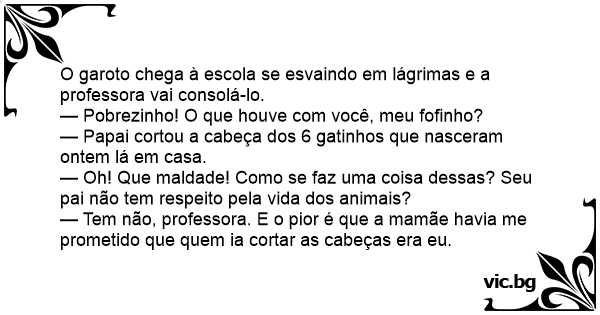 — Papai cortou a cabeça dos 6 gatinhos que nasceram ontem lá em casa.