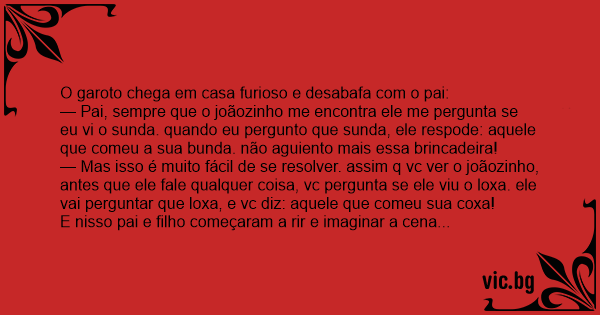 — Pai, sempre que o joãozinho me encontra ele me pergunta se eu vi o sunda. quando eu pergunto que sunda, ele respode: aquele que comeu a sua bunda. não aguiento mais essa brincadeira!