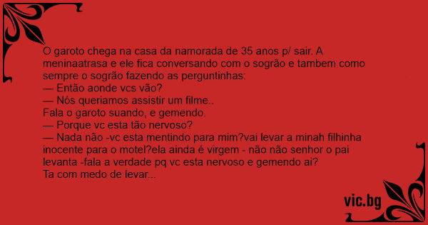 O garoto chega na casa da namorada de 35 anos p/ sair. A meninaatrasa e ele fiса conversando com o sogrão e tambem como sempre o sogrão fazendo as perguntinhas: