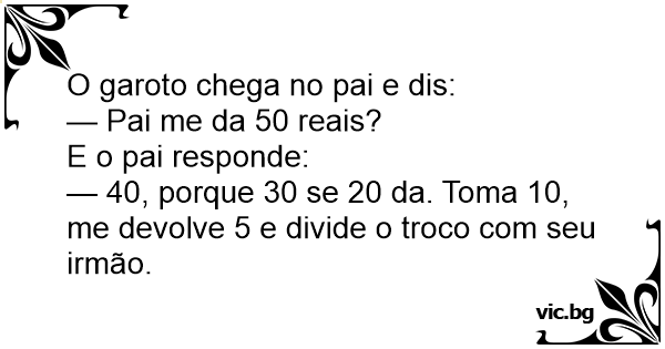 — 40, porque 30 se 20 da. Toma 10, me devolve 5 e divide o troco com seu irmão.