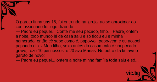 — Padre eu pequei. - Conte-me seu pecado, filho. - Padre, ontem a noite, todo mundo lá de casa saiu e só ficou eu e minha namorada, então cê sabe como é, papo-vai, papo-vem e eu acabei papando ela. - Meu filho, sеxо antes do casamento é um pecado grave, reze 10 pai nossos, e 20 ave Marias. No outro dia lá tava o garoto de novo: