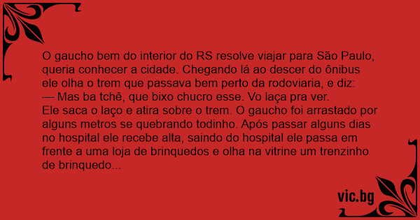 O gaucho bem do interior do RS resolve viajar para São Paulo, queria conhecer a cidade. Chegando lá ao descer do ônibus ele olha o trem que passava bem perto da rodoviaria, e diz: