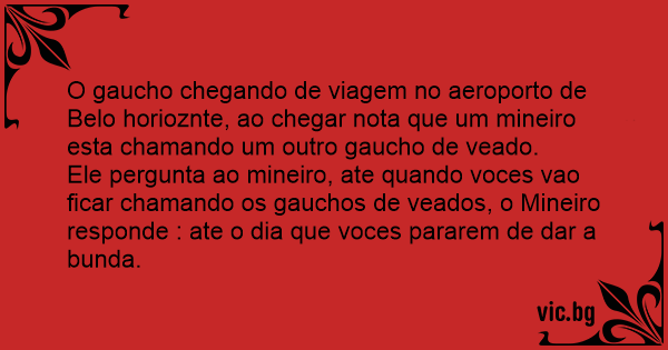 Ele pergunta ao mineiro, ate quando voces vao ficar chamando os gauchos de veados, o Mineiro responde : ate o dia que voces pararem de dar a bunda.