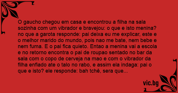 O gaucho chegou em casa e encontrou a filha na sala sozinha com um vibrador e bravejou: o que e isto menina? no que a garota responde: pai deixa eu me explicar, este e o melhor marido do mundo, pois nao me bate, nem bebe e nem fuma. E o pai fiса quieto. Entao a menina vai a escola e no retorno encontra o pai de roupao sentado no bar da sala com o copo de cerveja na mao e com o vibrador da filha enfiado ate o talo no rаво, e assim ela indaga: pai o que e isto? ele responde: bah tchê, sera que eu nao posso nem tomar uma cervejinha com o meu genro.