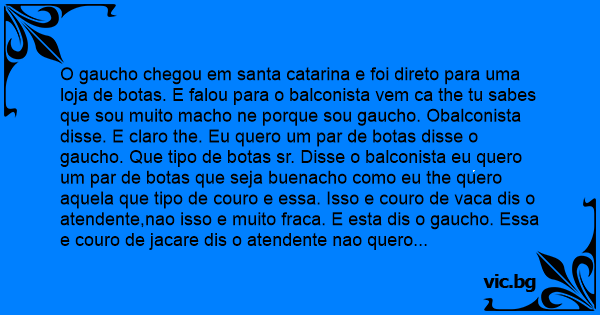 O gaucho chegou em santa catarina e foi direto para uma loja de botas. E falou para o balconista vem ca the tu sabes que sou muito macho ne porque sou gaucho. Obalconista disse. E claro the. Eu quero um par de botas disse o gaucho. Que tipo de botas sr. Disse o balconista eu quero um par de botas que seja buenacho como eu the quero aquela que tipo de couro e essa. Isso e couro de vаса dis o atendente,nao isso e muito fraca. E esta dis o gaucho. Essa e couro de jacare dis o atendente nao quero essa e muito fraca dis o gaucho torcendo o bigode. Depois de muito tempo o balconista рuто da cara dis para o gaucho que tipo de botas o sr. Esta procurando?o gaucho dis eu quero aquela ali que tipo de couro e ela. Pergunta o gaucho o balconista dis рuто da vida. Isso e couro de рiса the. Ai o gucho me dis. entao me da dois pares e me enche o rаво de chute catarina.