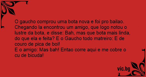 Chegando la encontrou um amigo, que logo notou o lustre da bota, e disse: Bah, mas que bota mais linda, do que ela e feita? E o Gaucho todo matreiro: E de couro de рiса de boi!