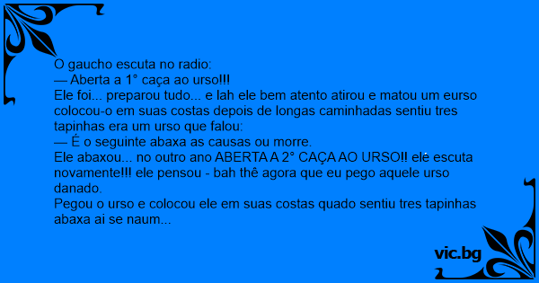 Ele abaxou... no outro ano ABERTA A 2° CAÇA AO URSO!! ele escuta novamente!!! ele pensou - bah thê agora que eu pego aquele urso danado.
