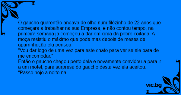 O gaucho quarentão andava de olho num filézinho de 22 anos que começara a trabalhar na sua Empresa, e não contou tempo, na primeira semana já começou a dar em cima da pobre coitada. A moça resistiu o máximo que pode mas depois de meses de apurrinhação ela pensou: