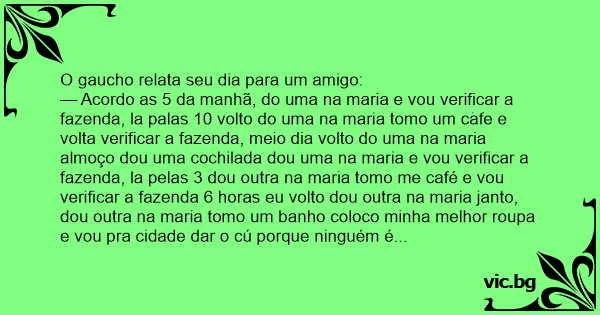 — Acordo as 5 da manhã, do uma na maria e vou verificar a fazenda, la palas 10 volto do uma na maria tomo um cafe e volta verificar a fazenda, meio dia volto do uma na maria almoço dou uma cochilada dou uma na maria e vou verificar a fazenda, la pelas 3 dou outra na maria tomo me café e vou verificar a fazenda 6 horas eu volto dou outra na maria janto, dou outra na maria tomo um banho coloco minha melhor roupa e vou pra cidade dar o cú porque ninguém é de ferro!!!