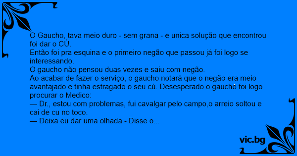 Ao acabar de fazer o serviço, o gaucho notará que o negão era meio avantajado e tinha estragado o seu cú. Desesperado o gaucho foi logo procurar o Medico: