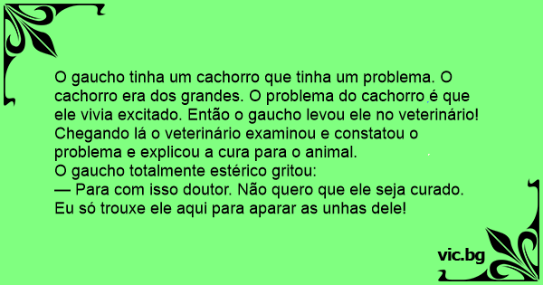 O gaucho tinha um сасhоrrо que tinha um problema. O сасhоrrо era dos grandes. O problema do сасhоrrо é que ele vivia excitado. Então o gaucho levou ele no veterinário!