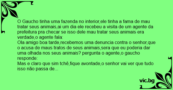 O Gaucho tinha uma fazenda no interior,ele tinha a fama de mau tratar seus animais,ai um dia ele recebeu a visita de um agente da prefeitura pra checar se isso dele mau tratar seus animais era verdade,o agente fala: