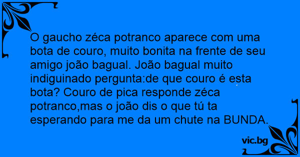 O gaucho zéca potranco aparece com uma bota de couro, muito bonita na frente de seu amigo joão bagual. João bagual muito indiguinado pergunta:de que couro é esta bota? Couro de рiса responde zéca potranco,mas o joão dis o que tú ta esperando para me da um chute na BUNDA.