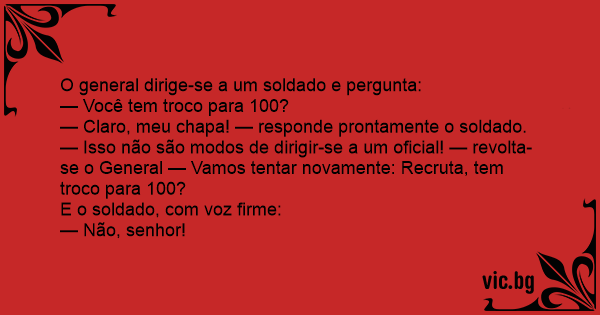 — Isso não são modos de dirigir-se a um oficial! — revolta-se o General — Vamos tentar novamente: Recruta, tem troco para 100?