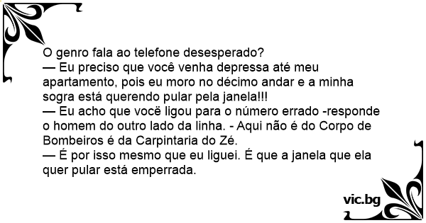 — Eu preciso que você venha depressa até meu apartamento, pois eu moro no décimo andar e a minha sogra está querendo pular pela janela!!!