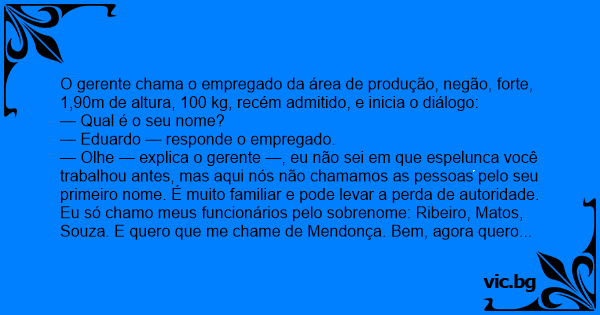 — Olhe — explica o gerente —, eu não sei em que espelunca você trabalhou antes, mas aqui nós não chamamos as pessoas pelo seu primeiro nome. É muito familiar e pode levar a perda de autoridade. Eu só chamo meus funcionários pelo sobrenome: Ribeiro, Matos, Souza. E quero que me chame de Mendonça. Bem, agora quero saber: Qual é o seu nome completo?