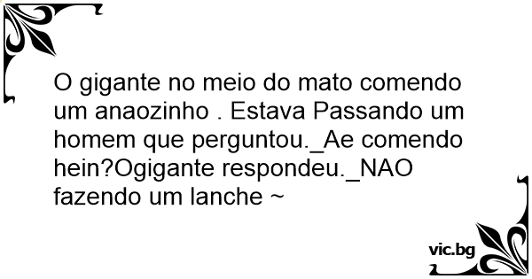 O gigante no meio do mato comendo um anaozinho . Estava Passando um homem que perguntou._Ae comendo hein?Ogigante respondeu._NAO fazendo um lanche ~