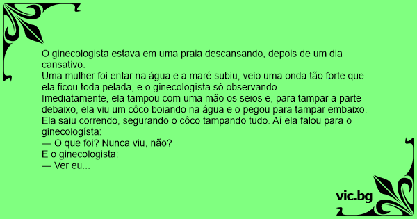 Uma mulher foi entar na água e a maré subiu, veio uma onda tão forte que ela ficou toda pelada, e o ginecologísta só observando.