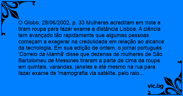 O Globo, 28/06/2002, p. 33 Mulheres acreditam em trote e tiram roupa para fazer exame à distância Lisboa. A ciência tem avançado tão rapidamente que algumas pessoas começam a exagerar na credulidade em relação ao alcance da tecnologia. Em sua edição de ontem, o jornal português 'Correio da Manhã' disse que dezenas de mulheres de São Bartolomeu de Messines tiraram a parte de cima da roupa em quintais, varandas, janelas e até mesmo na rua para fazer exame de 'mamografia via satélite, pelo raio laser'. Em reportagem intitulada 'Mamas ao léu', o jornal garantiu que as portuguesas foram convencidas a tirar a roupa por uma mulher que, por telefone, se identificava como médica e elogiava as vantagens da 'nova tecnologia de mamografia por satélite'. Para que se submetessem ao novo exame, a suposta médica afirmava, segundo o 'Correio da Manhã', que elas precisavam apenas ficar 'num local visível', de onde o 'satélite as pudesse captar'. Uma das vítimas disse que chegou a ir para uma colina tirar a parte de cima da roupa. - Estava perto da estrada e quando passava um carro, escondia-me, para que não pensassem que estava maluca. Uma amiga minha ficou com os seios nus à porta de casa e outras puseram-se à janela - disse a mulher, segundo o jornal. Ela apresentou à polícia um folheto com desenhos de mulheres com os seios nus distribuído em Messines, anunciando a 'mamografia por satélite'. Essa não é a primeira vez que portuguesas caem no trote: há um ano, em Lisboa, mulheres exibiram os seios para fazer a suposta mamografia.