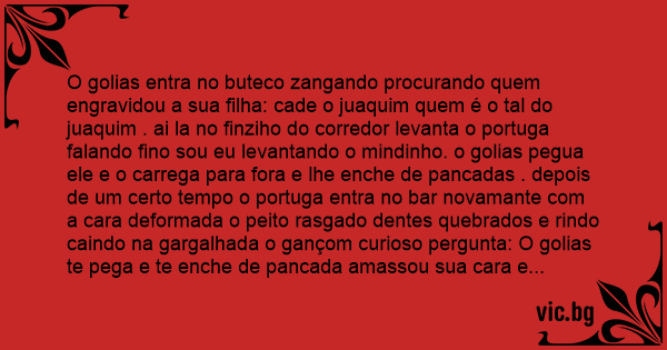 O golias entra no buteco zangando procurando quem engravidou a sua filha: cade o juaquim quem é o tal do juaquim . ai la no finziho do corredor levanta o portuga falando fino sou eu levantando o mindinho. o golias pegua ele e o carrega para fora e lhe enche de pancadas . depois de um certo tempo o portuga entra no bar novamante com a cara deformada o peito rasgado dentes quebrados e rindo caindo na gargalhada o gançom curioso pergunta: O golias te pega e te enche de pancada amassou sua cara e voce ai caindo na gargalhada? ele responde: hehehehe é que eu enganei ele meu nome naum é joaquim é fernado