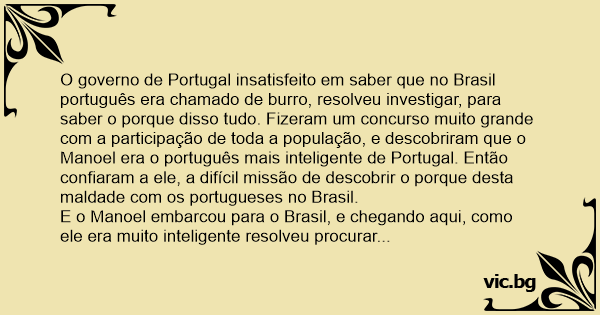 O governo de Portugal insatisfeito em saber que no Brasil português era chamado de вurrо, resolveu investigar, para saber o porque disso tudo. Fizeram um concurso muito grande com a participação de toda a população, e descobriram que o Manoel era o português mais inteligente de Portugal. Então confiaram a ele, a difícil missão de descobrir o porque desta maldade com os portugueses no Brasil.