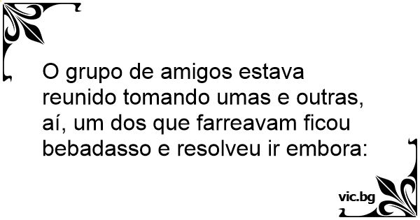O grupo de amigos estava reunido tomando umas e outras, aí, um dos que farreavam ficou bebadasso e resolveu ir embora: