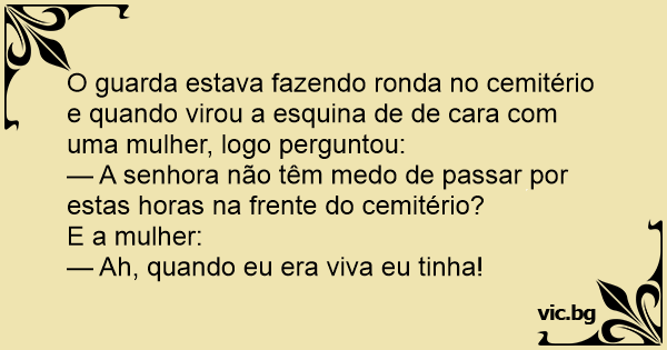O guarda estava fazendo ronda no cemitério e quando virou a esquina de de cara com uma mulher, logo perguntou: