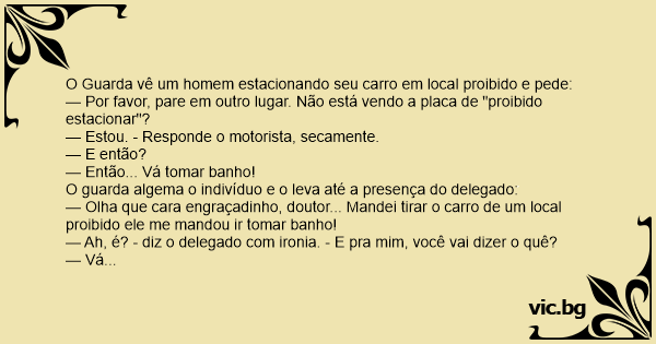— Olha que cara engraçadinho, doutor... Mandei tirar o carro de um local proibido ele me mandou ir tomar banho!