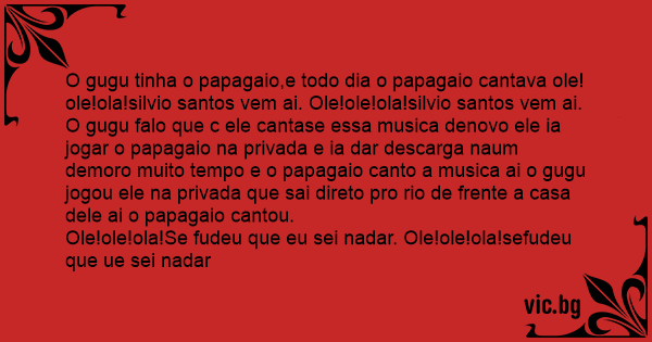 O gugu tinha o papagaio,e todo dia o papagaio cantava ole!ole!ola!silvio santos vem ai. Ole!ole!ola!silvio santos vem ai. O gugu falo que c ele cantase essa musica denovo ele ia jogar o papagaio na privada e ia dar descarga naum demoro muito tempo e o papagaio canto a musica ai o gugu jogou ele na privada que sai direto pro rio de frente a casa dele ai o papagaio cantou.