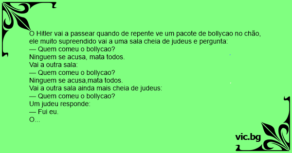 O Нiтlеr vai a passear quando de repente ve um pacote de bollycao no chão, ele muito supreendido vai a uma sala cheia de judeus e pergunta: