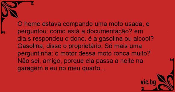 O home estava compando uma moto usada, e perguntou: como está a documentação? em dia,s respondeu o dono. é a gasolina ou alcool? Gasolina, disse o proprietário. Só mais uma perguntinha: o motor dessa moto ronca muito? Não sei, amigo, porque ela passa a noite na garagem e eu no meu quarto...