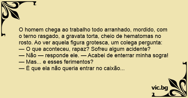 Zé chega na casa do amigo todo arrebentado, sujo, roupa rasgada, arranhado... O amigo muito espantado pergunta: - Cara! Você ta vindo de onde? - Do enterro da minha sogra... Responde ele. - Nossa!...