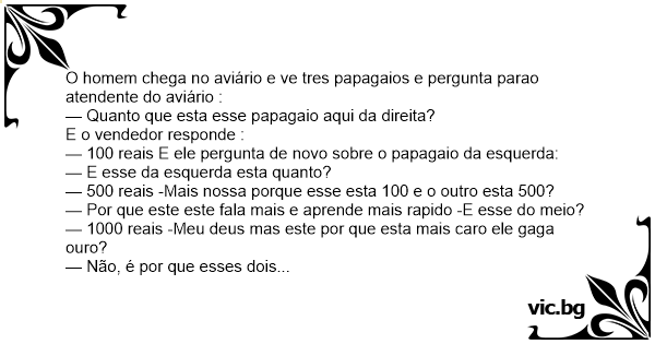 The Boss Papagei Един ден Петър влиза в магазин за домашни любимци с намерението да си купи папагал. Влиза клиент в зоомагазин и пита продавача, защо папагалите са с различна цена. Продавачът му обяснява: Един човек влязъл в зоомагазин и попитал за цената на един папагал. Ein Mann geht in eine Zoohandlung, er möchte einen Papagei kaufen. Dans une animalerie, un gars souhaite adopter un perroquet. Le vendeur lui dit : Erkundigt sich einer in einer Zoohandlung nach einem Papagei. Ein Mann betritt eine Tierhandlung, um einen Papagei zu kaufen. Der Verkäufer zeigt die drei vorrätigen Exemplare. Der erste Papagei ist herrlich bunt, bildschön und 50 cm gross. "Na ja", denkt der Käufer, der wird wohl recht teuer sein. Er fragt den Verkäufer nach dem Preis: "1.000 Euro! Aber... Un tizio entra in un negozio di animali per comprare un pappagallo. Il negoziante avverte che ne ha solo tre e molto costosi. Il primo costa 10 milioni ed e' in grado di programmare un computer, il secondo costa 50 milioni e oltre che a programmare e' in grado di progettare computer. Il terzo... Un hombre entra en una pajarería y ve tres hermosos loros. -¿Cuánto cuestan? -le pregunta al empleado-. -Este sabe inglés, francés y alemán. Por cinco mil dólares es suyo. -¿Y el de al lado? -Bueno, ése también sabe tres idiomas, pero además es ingeniero y técnico en computación. Se lo lleva por... Um cara entra numa loja de animais, querendo comprar um papagaio e encontra três idênticos numa gaiola e pergunta o preço: — O da esquerda custa 500 reais — diz o dono. — Nossa, que caro! Por que... Un gars veut s'acheter un perroquet. Il en voit à la vitrine d'une animalerie. Il explique ce qu'il veut et le vendeur lui propose: - Je peux vous proposer celui-ci: Il est bilingue... Facet chciał kupić papugę. Pyta: - Ile za tą? - i wskazuje palcem. - Ta 1000 zł, mówi po polsku i angielsku. - A ta zielona? - 2000 zł, mówi po polsku, angielsku i rosyjsku. - A ta niebieska? -... Um certo dia um menino e seu pai passam na frente de uma loja de pássaros, e seu filho diz: - Papai, compra um papagaio pra mim. E seu pai responde: - Vamos lá olhar os preços. E ele todo... Neulich in der Tierhandlung: Ein Kunde will einen Papagei kaufen. Es stehen 3 Papageien zur Auswahl. Der Kunde zeigt auf den Ersten: "Was kostet der?“ Tierhändler: "100 Euro.“ Kunde: "Warum ist der... Un vendedor de loros tenía a la venta un loro grande, uno mediano y otro lorito chico, rasca, poca cosa, una porquería de loro. Una persona se interesa en comprar uno de los loros. ¿Cuánto vale el... Een man gaat naar een dierenwinkel om een papegaai te kopen. De eigenaar van de winkel wijst drie papegaaien aan die er hetzelfde uitzien en zegt: "Deze papegaai aan de linkerkant kost 1000... Un gars veut acheter un perroquet. Il se rend chez le marchand De perroquets et demande au vendeur: - Bonjour, je voudrais un perroquet. - Nous en avons trois. Un a 1000 F, un a 2000 F, et un autre... Egy nő bemegy a kis állatkereskedésbe és a papagájok után érdeklődik. Az egyik kalitkában 3, különösen szép papagáj üldögél, a jobb szélsőre rámutat az eladó: - Ez itt például 5000 forintba kerül.... Un hombre está vendiendo loros en la calle. Lleva un loro en el hombre, otro loro en el codo y otro loro en la mano. Pasa un cliente y le pregunta: -¿ Cuánto vale el loro que tiene en la mano? -... Um garoto entra em uma loja de animais para comprar um papagaio se dirige ao balconista e fala: — Eu queria comprar um papagaio. — Tem aqueles 3 ali, fala o balconista apontanto para um canto. —... Viene un hombre a la tienda de animales y le pregunta al vendedor si le puede enseñar unos cuantos loritos, pero de los mejores... El vendedor le acompaña y le enseña al primer loro: Comprador:... O cara foi na loja de animais para comprar um papagaio. ao chegar la viu dentro d uma gaio la 3 papagaios .1bonitao, 1mais ou menos e um mais feio, magrinho e arrepiado. pediu entao ao dono da loja... Bemegy egy fickó az állatkereskedésbe, mert szeretne venni egy papagájt... Kérdezi az eladót: - Mennyibe kerül ez a papagáj? - Ez 10.000 Ft. El tudja énekelni a magyar himnuszt. - És ez a másik? -... Влегол човек во продавница за домашни миленици и бара да купи папагал. Продавачот му покажува три и му вели дека првиот чини 5.000 денари. - Зошто е толку скап? - Па знае 1,000 зборови, а решава и... Ein Mann will einen Papagei kaufen. Er sieht sich verschiedene an und entschließt sich zum Kauf eines besonders schönen Exemplares. Der herbeigerufene Verkäufer erklärt, dieser Papagei kostet... The pet store was selling three parrots. A man who wants to buy a parrot approaches the clerk and asks, “How much are your parrots?” The sales clerk answers, “The first one is $1,000.” “What does... Em uma loja de animais o cliente chega para comprar um papagaio e olha o primeiro e pergunta ao dono da loja: Quanto custa este aqui? Este custa R$ 5.000,00 diz o vendedor O cliente pergunta: por... O rapaz resolveu comprar um papagaio e chegando a uma loja de aves havistou 3 papagaios proximos e logo perguntou ao vendedor: — Quanto custa aquele pagagaio da gaiola esquerda? O vendedor... Um homem entra em uma loja de animais querendo comprar um papagaio. Nessa loja haviam somente 3 papagaios e o homem pergunta: — Quanto custa esse papagaio? E o vendedor responde: — Mil reais. O... Adamın biri bir papağan almak ister ve bir petshopa gider. Gözüne bir papağan kestirir ve bu papağanın fiyatını sorar. - Affedersiniz, bu papağan kaç para? - 100 bin - Allah Allah! Niye bu kadar...